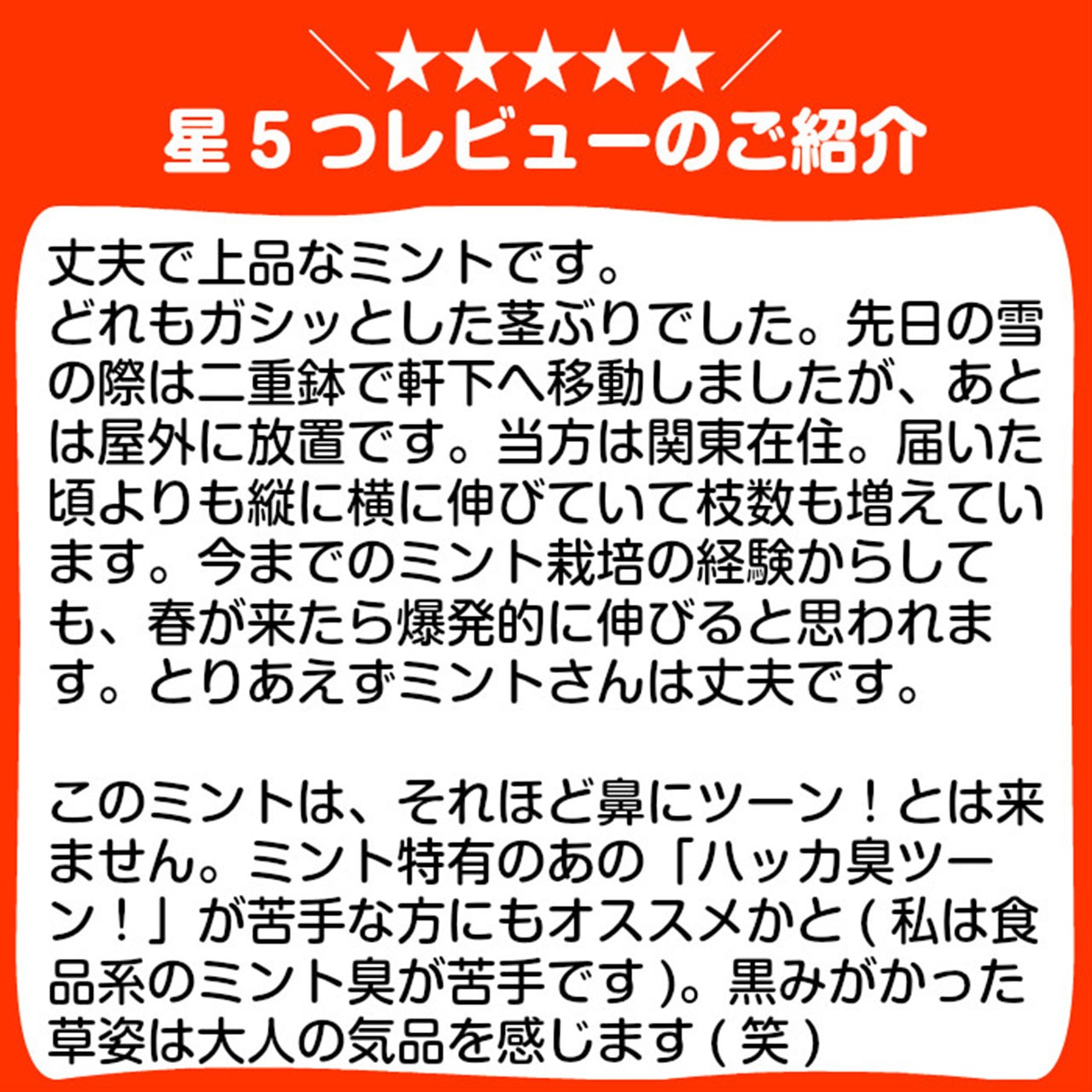 丈夫なハーブで比較的季節を問わず栽培できるのでビギナーの方にもおすすめです。ぜひ揃えておきたい人気の苗はペパーミントとスペアミントの苗。またアップルミント、パイナップルミント、グレープフルーツミント、オレンジミントなど香りのする植物の名前がついたミントの他に、イングリッシュミント、ペニーロイヤルミント、マウンテンミント、ホースミントなど限りなく仲間がいます。地中海沿岸原産のハーブと異なり、日本の蒸し暑さにも強く半日陰でもランナーがどんどん伸びて旺盛に育ちます。あまり強い日差しを必要としないので明るい室内でも栽培できます。冬は室内に取りこむことで一年中緑の葉に保つことができます。水耕栽培で簡単につくれるミントですが本来ハーブは野生のもので水耕栽培だと香りが薄くなります。ハーブ本来の強烈な香りがする当店のハーブ苗をぜひお楽しみください。■学名:Mentha ■分類:シソ科多年草 ■原産地:地中海沿岸、アフリカ ■コンパニオンプランツ:トマトやアブラナ科の植物 風味をよくします。アリやアブラムシを寄せつけません ■収穫箇所と主な利用法:「葉」「茎」をハーブティーやスイーツの飾りに、ハーブバスに
